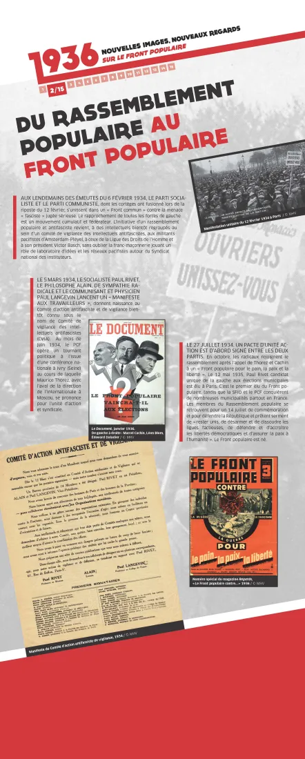 L’exposition itinérante, « 1936, nouvelles images, nouveaux regards sur le Front populaire », richement illustrée de plus de 50 images et présentée en 15 panneaux, offre un aperçu synthétique de l’exposition présentée au musée de l’Histoire vivante à Montreuil.